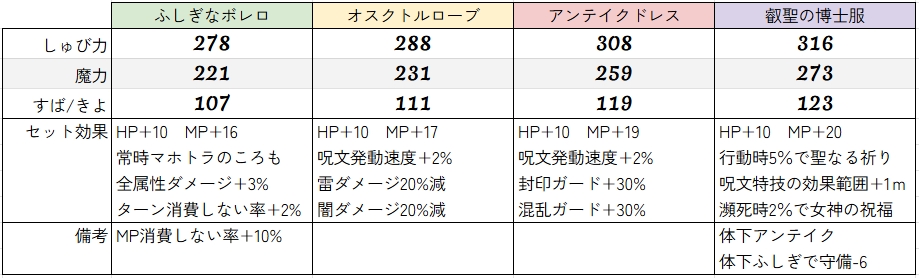 加えて体下がセット装備に含まれず、ふしぎなボレロ下を使うことで守備力6と引き換えにMP消費しない率+5%を確保出来たりもする